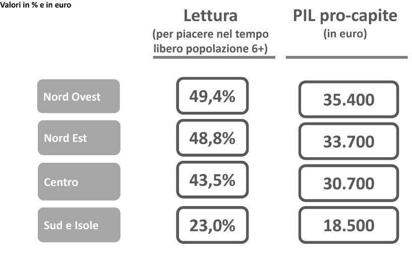 Lo stesso report dell’AIE ci illustra la differenza del potere di acquisto tra le regioni italiane, determinata anche dal loro PIL, nel quale traspare la relazione fra la situazione economica e la quantità di libri acquistati.