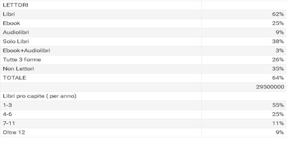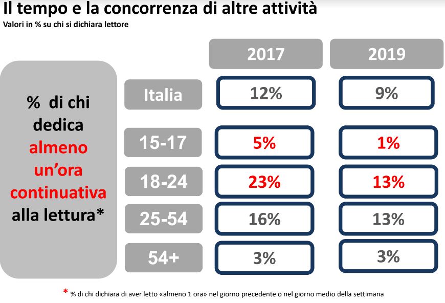 Infatti il tasso dei non lettori si è leggermente abbassato (-5%) rispetto al 2018, quindi sinonimo che forse gli italiani si siano dedicati maggiormente alla lettura rispetto agli anni passati. Sono anche aumentati gli acquirenti di ebook e audiolibri, al contempo aumentano i lettori occasionali rispetto ai lettori assidui. Le abitudini di fruizione e di tempo dedicato rispetto agli anni precedenti registra un calo del tempo libero e disponibile per la lettura.