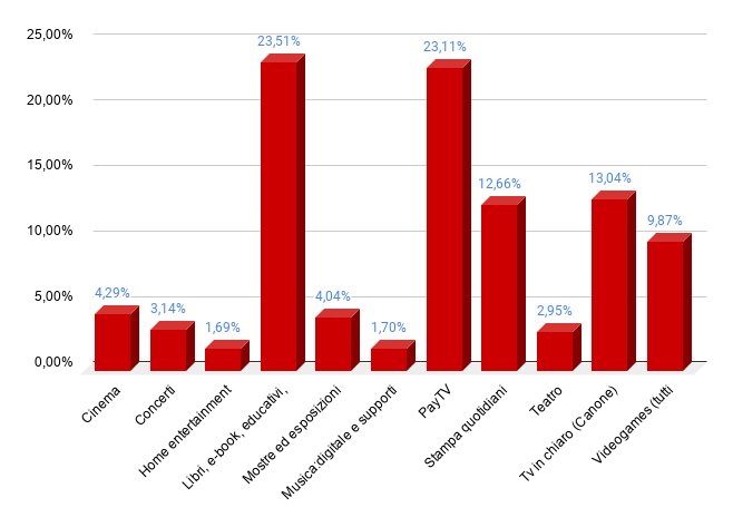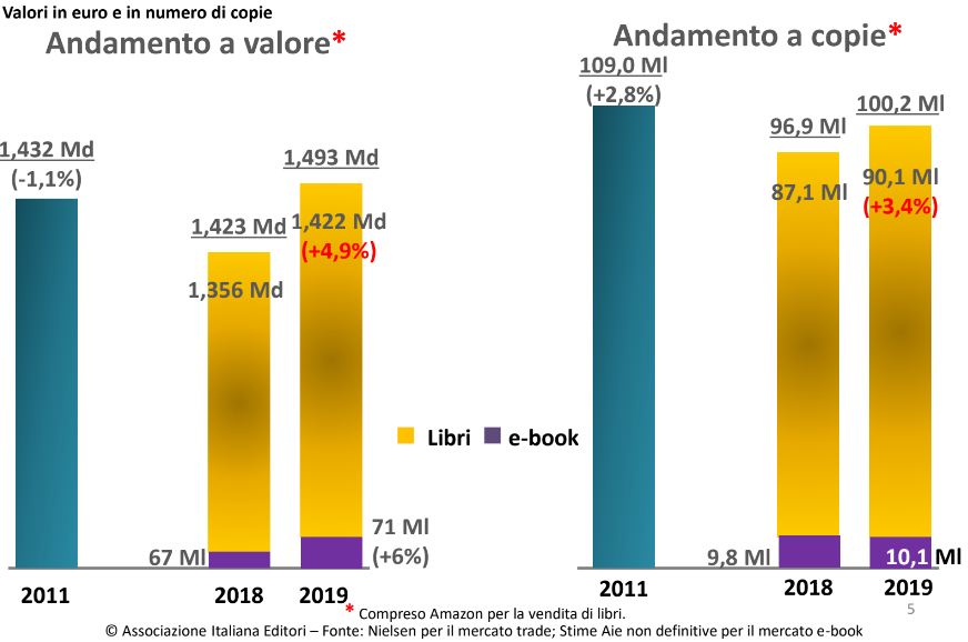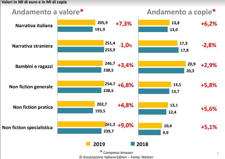 - LIBRI: un aumento del 4,9%, con una crescita di introiti rispetto al 2018 di 60 milioni di euro e un aumento delle pubblicazioni del 3,4%. Allo stesso modo degli ebook, le copie prodotte sono calate di circa di 9 milioni, segno di una decrescita nelle proposte editoriali.