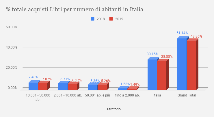 Un dato interessante ci viene fornito da questo grafico, elaborato con dati dell’ISTAT circa la percentuale totale di acquisti di libri cartacei, dove individuiamo un calo nel 2019 del 2% in tutta Italia, dal 51% al 49%. Il Nord si consolida come maggior acquirente di prodotti editoriali, libri e stampa con quote più stabili, mentre sono in lieve decrescita al Centro e nel Sud Italia. Balza all’occhio il “dove” si acquista: una tendenza maggiore nelle zone tra i 10.000 e i 50.000 abitanti (circa 2,4%) rispetto ai centri urbani più consistenti con più di 50.000 abitanti (circa un 1,88%).