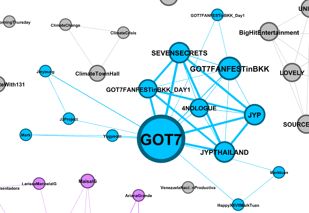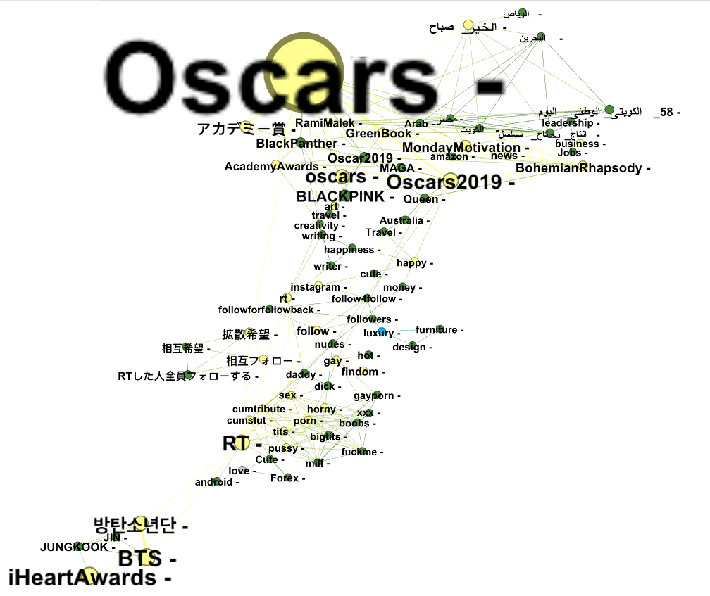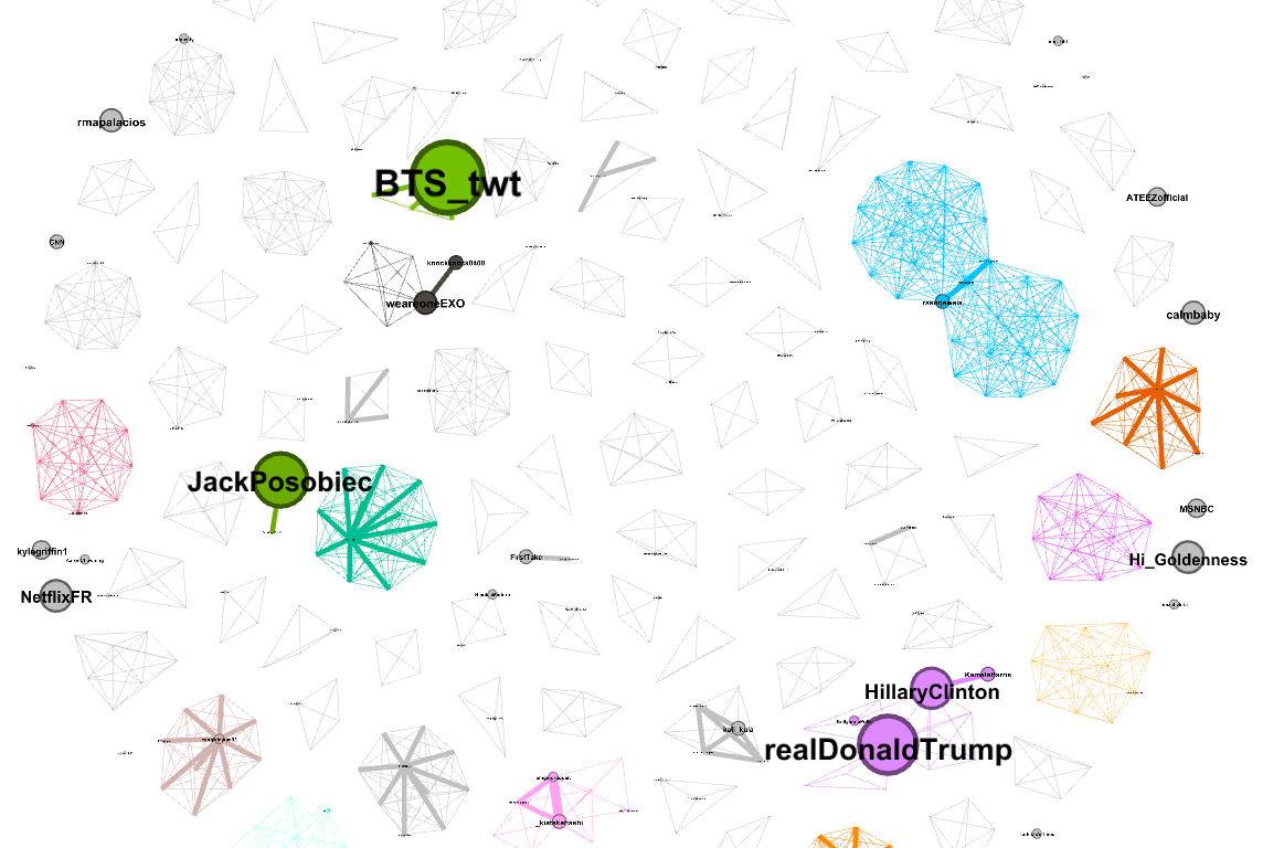 Nodi e archi per hashtag e utenti sono salvati separatamente in 4 file. Importandoli in Gephi si ricostruiscono le reti semantiche (hashtag) e quelle sociali (utenti) relative all’intervallo temporale selezionato. Per generare le immagini che seguono sono stati applicati opportuni filtri sia sui nodi (degree range), sia sugli archi (edge weight) per semplificare le reti. La dimensione dei nodi è proporzionale alla loro frequenza, così come lo spessore degli archi. Gli algoritmi di layout ForceAtlas2 e Fruchterman Reingold con una scelta ad hoc dei parametri hanno permesso una visualizzazione più chiara delle reti, in particolare delle componenti connesse. In alcuni casi sono state calcolate esplicitamente mediante l’applicazione dell’algoritmo di analisi Connected Components e l’applicazione di una colorazione opportuna (Appearance > Nodes > Color > Partition > Component ID). Gli orari indicati si riferiscono al fuso della costa est degli Stati Uniti.