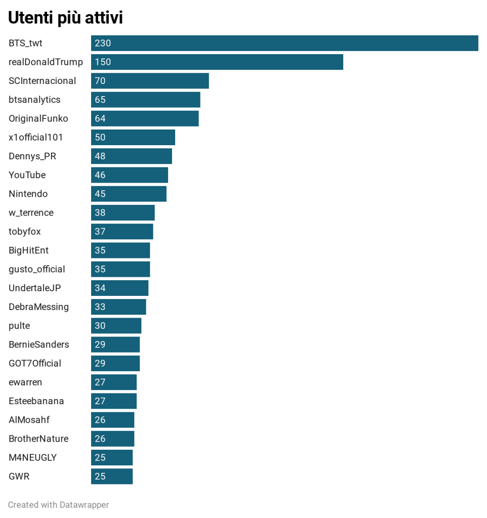 La fonte dati primaria è l’Internet Archive, in particolare un sottoinsieme dei tweet prodotti a settembre 2019 (stima del volume: circa 4 mila tweet al minuto). I dati sono organizzati in collezioni di file jsonl compressi (bzip2).